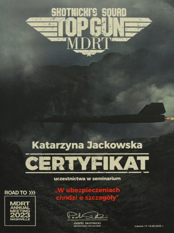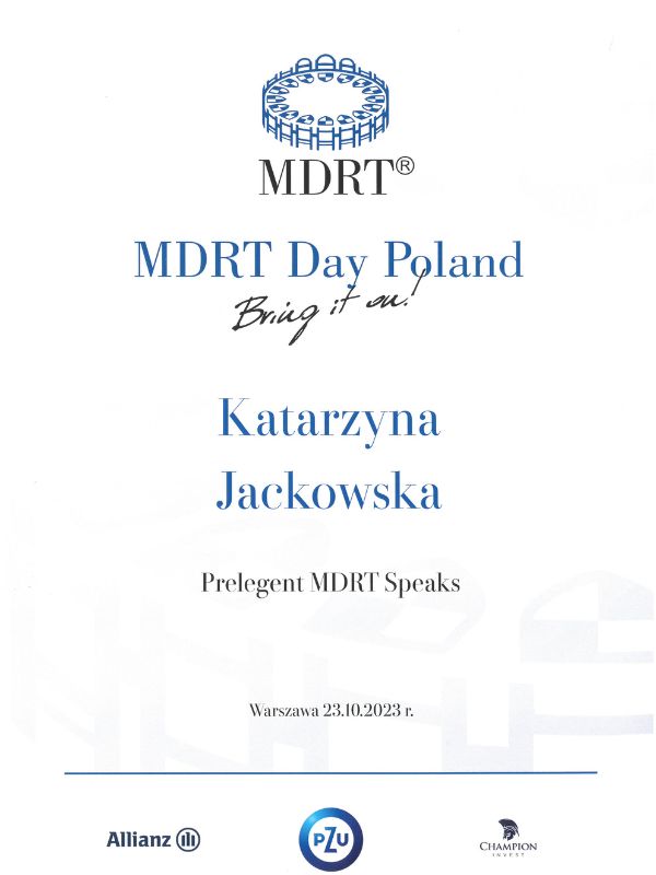 Pięciokrotna zdobywczyni MDRT (Million Dollar Round Table) – prestiżowego wyróżnienia w branży ubezpieczeń, które zrzesza mniej niż 1% najlepszych doradców ubezpieczeniowych na świecie.